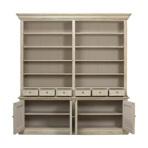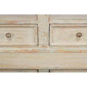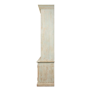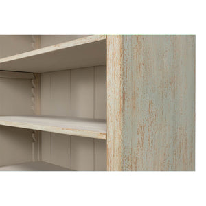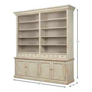 Traditional style Rustic painted bookcase with soft antique blue wash painted finish on reclaimed pine. With a molded cornice, adjustable shelves, six mid drawers and four cabinet doors below raised on a square plinth base.