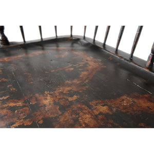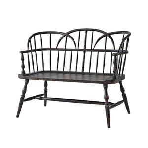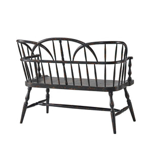 A Windsor style rustic painted hoop back bench with a triple arched back with turned slats and arms and turned uprights, the shaped seat above turned splayed legs. Inspired by an 18th century Hickory original.