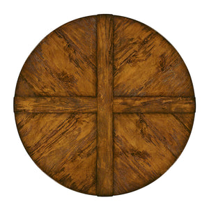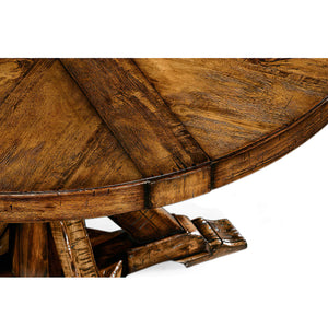A round dining table finished in a warm walnut color with a rustic finish showing exposed saw marks and set on a bracketed country kitchen base.