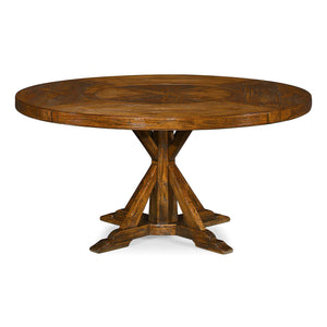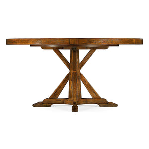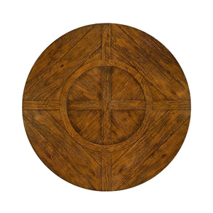 A round dining table finished in a warm walnut color with a rustic finish showing exposed saw marks and set on a bracketed country kitchen base, the table also has a built-in self-storing lazy susan.