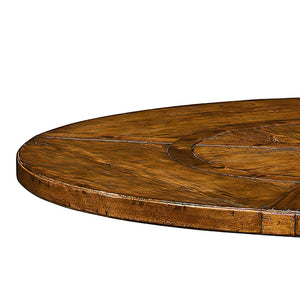 Rustic Round Dining Table - Walnut, a large round dining table in a walnut finish with a rustic finish showing exposed saw marks and set on a bracketed country kitchen base, the table also has a built-in self-storing lazy susan.