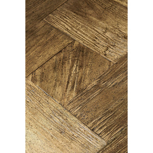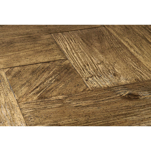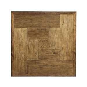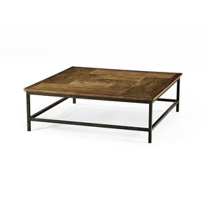 Elevate your living space with the rustic charm and contemporary design of this Rustic Square Coffee Table. Crafted from acacia wood with a distressed block-style parquetry veneered top, its rich medium brown driftwood finish enhances the natural beauty of the wood grain. The contrast of the etched brass and acid-etched detailing adds a refined touch, while the industrial-style iron base provides a sturdy foundation with sleek stretchers for additional support.