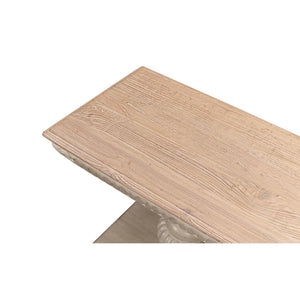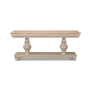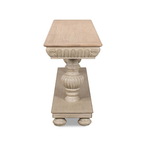 Rustic Stone Gray Console Table, a dramatic transitional pine console. With a natural wooden top above an antiqued stone gray painted base. With carved volutes around the frieze, atop two carved baluster pedestals.