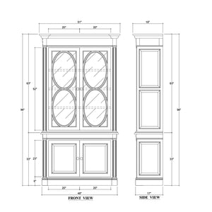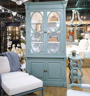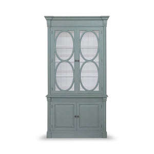The cabinet features upper glass doors framed by oval motifs, adding architectural grace and timeless appeal. Below, paneled doors conceal generous storage space. With its refined proportions and painted finish, this piece brings French country sophistication to dining rooms, home offices, or compact living areas.