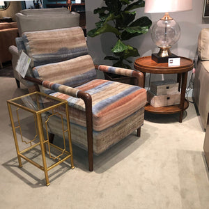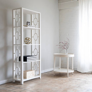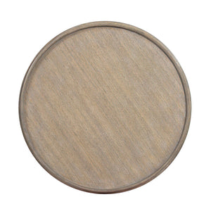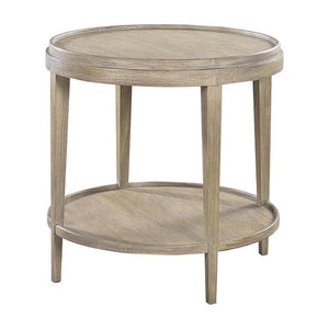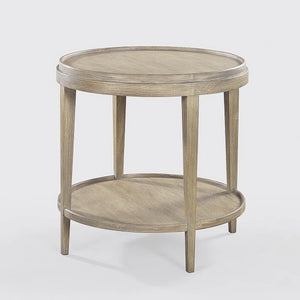 A Small Greyed Classic Round End Table. A classic style round end table with a rustic and slightly distressed greyed painted finish showing slight grain accents in celtis veneer. The two-tier side table with a wooden galleried dish top, with square tapered legs and a round shelf stretcher base.