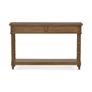 The warm straw wash finish highlights the natural beauty of the mahogany, creating a refined and luxurious look. Designed for both style and functionality, this console table features four spacious drawers adorned with chic ring pulls, providing ample storage for your essentials.