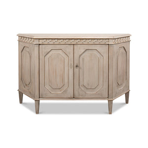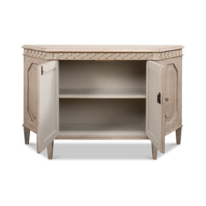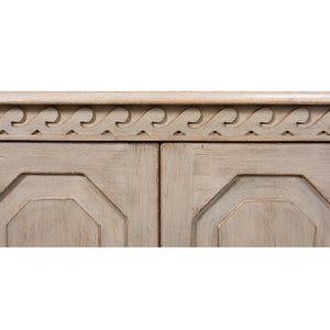 A masterful fusion of shape, scale, and craftsmanship, the Stone Painted Credenza, finished in an exquisite hand-rubbed Stone Grey finish, is a statement of timeless elegance. Crafted from reclaimed pine, this sophisticated piece features canted ends and intricate Vitruvian scrolls, adding a refined architectural element to any interior.