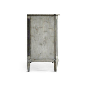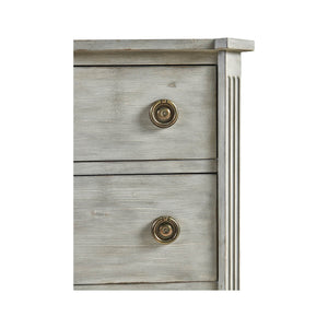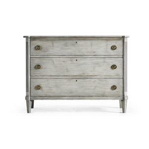 Large 48" wide Swedish painted commode, this neo-classic painted commode in an antiqued grey finish with three long lockable drawers, canted corners with fluted stiles, and brass ring pull handles on square tapered legs.