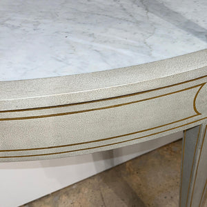 Our Swedish Painted Console Table is meticulously crafted, showcasing unparalleled attention to detail. The inset polished Cararra white marble top exudes opulence, elevating the aesthetic appeal of any space.