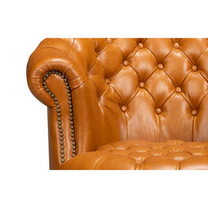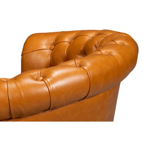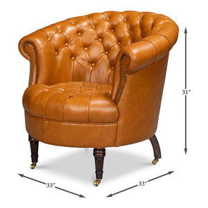 The Tan Saddle Leather Barrel Back Chair exemplifies classic English design and luxurious craftsmanship. Upholstered in rich, top-grain Tan Brown leather, its elegantly curved barrel back is adorned with deep button tufting, exuding timeless sophistication.
