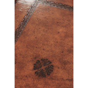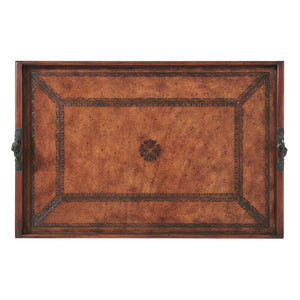Tooled Leather Serving Tray - An English style brown tooled leather covered tray of rectangular shape with gallery and brass handles of clasping hands.