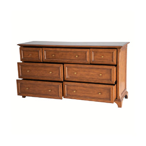 Traditional Long Dresser with an Ogee edge top, beveled decorative trim corners, hand-cast brass knobs, raised on bracket feet with a hand-rubbed warm rustic wood tone lightly distressed finish.