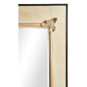 Featuring a hand-carved solid oak frame with intricate detailing, set against a subtle parchment background for a refined look. The frame is finished in an ebonized oak with a parchment finish, creating a beautiful contrast that enhances its traditional style while adding a contemporary twist.