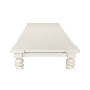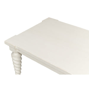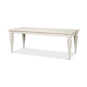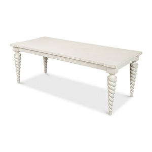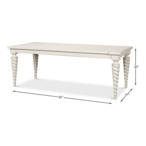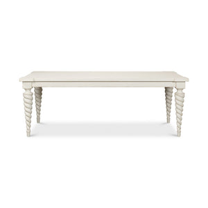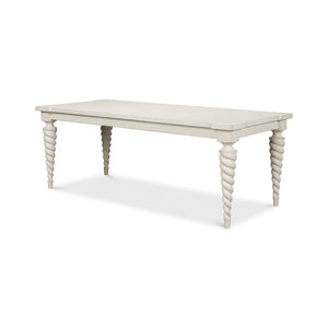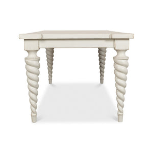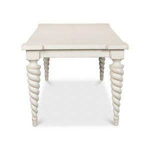 At the heart of its design are the rope-turned spiral legs, which offer a whimsical yet refined take on classic table structures. These unique legs support a generously sized tabletop with a recessed edge, giving the piece a delicate, floating appearance.