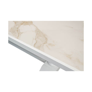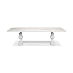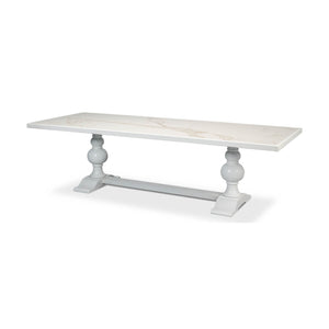 Experience timeless elegance with our White Painted Baroque Style Dining Table. The Calacatta porcelain inlaid top becomes a focal point, adding finesse to your dining area. Supported by a turned baluster double pedestal base, this table marries classic charm with modern style. The white painted finish completes the look, creating a dining space that transcends trends.