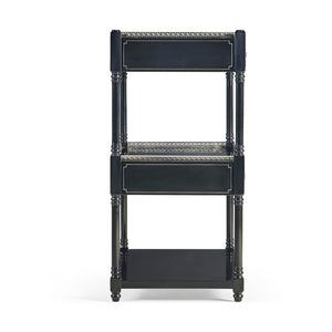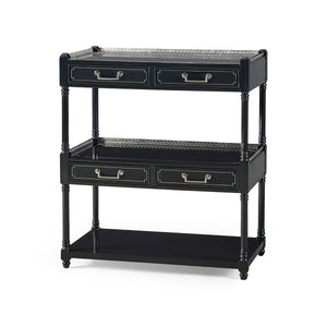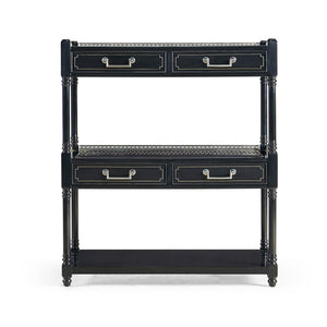 English Regency style three-tier wide painted etagere, capturing the essence of old-world drama and modern luxury. Black lacquered, the solid hardwood case features two double drawer shelves with white brass accents and gallery that beg to be laden with a decanter set and fine bottles of exquisite spirits. A floor shelf provides extra storage for oversized items.