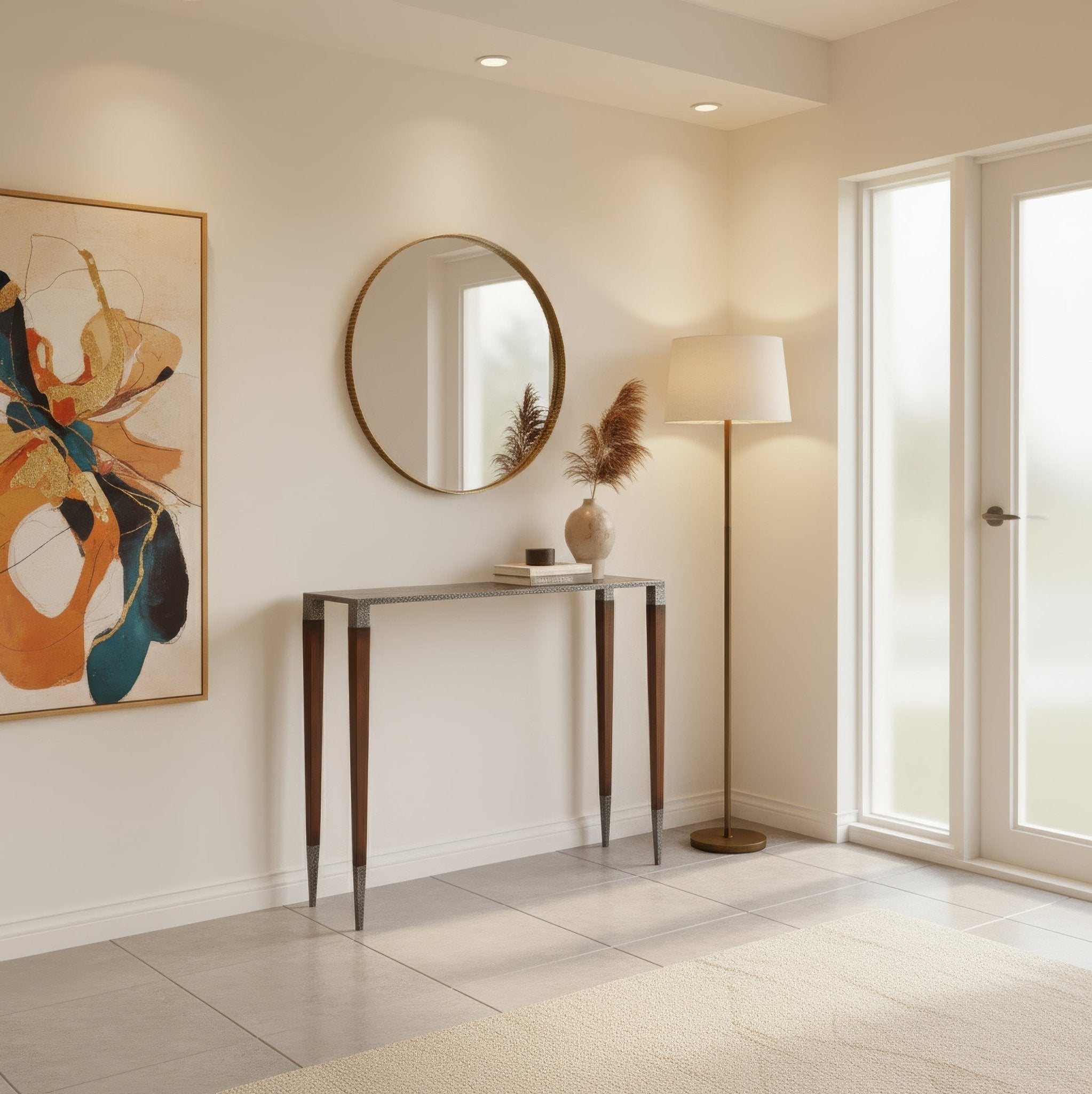 Perfectly scaled for hallways, entryways, or behind a sofa, the slim profile allows this table to fit seamlessly into smaller spaces without sacrificing presence. The mix of warm wood and textured metal adds depth and dimension, making it an elegant accent for both contemporary and traditional interiors. A balance of craftsmanship and design, this piece reflects understated luxury in every detail.