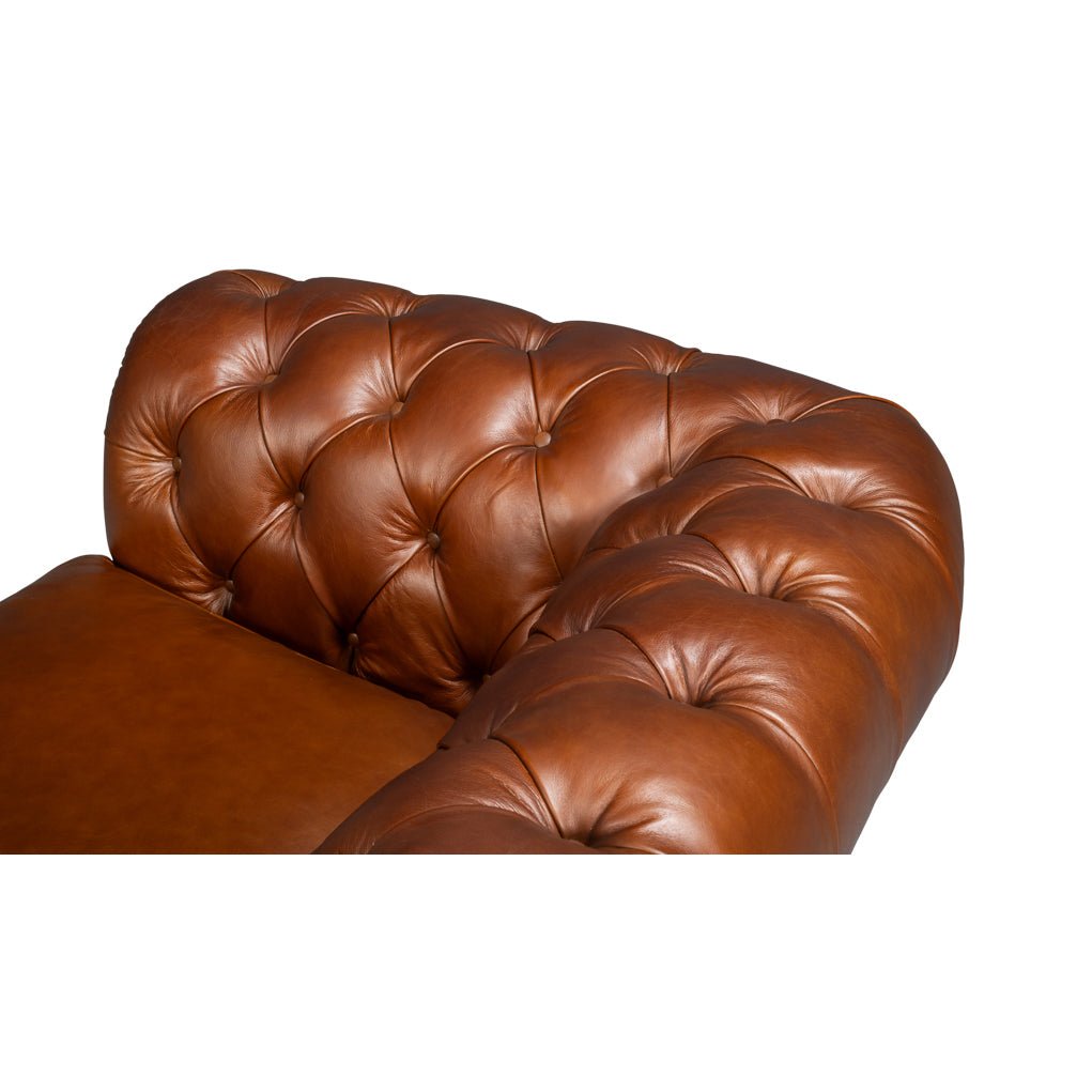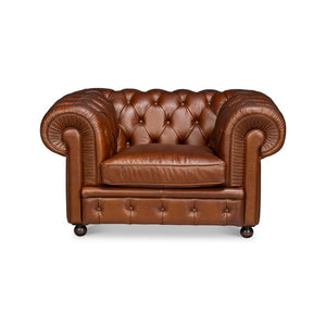 The British Brown Leather Chesterfield Armchair – Tufted Rolled Arm Club Chair reflects the refinement of classic British design with its balanced proportions and iconic details. Deep button tufting covers the backrest and front panel, while rolled arms at a uniform height form the unmistakable Chesterfield silhouette linked to tradition, intellect, and quiet authority.
