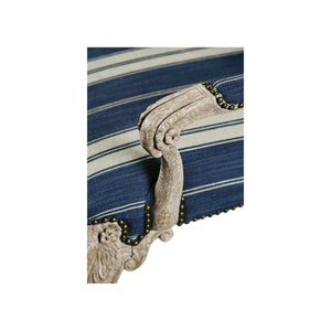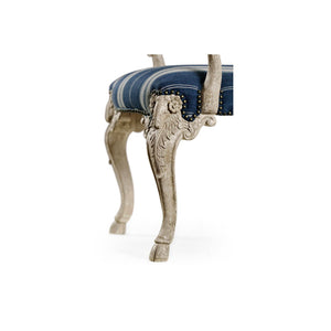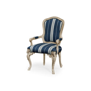 The chair’s indigo and ivory ticking stripe upholstery adds a modern touch to its classic shape. Scrolled arms with padded elbow rests make it comfortable, and the tall, shaped back gives it a stately look. This mix of detailed carving and relaxed fabric makes the armchair versatile, blending traditional style with everyday comfort.