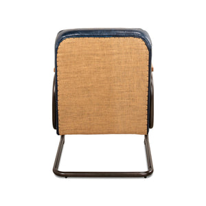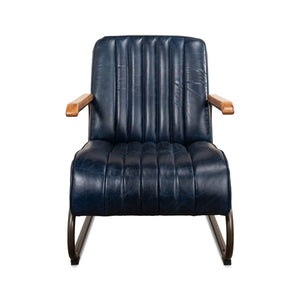 Industrial Blue Leather Armchair, a modern leather armchair with top-grain Chateau Bluevintage leather with chaneled and boxed backrest and seat cushion, jute upholstery to rear and oak armrests supported by a metal industrial frame.
