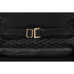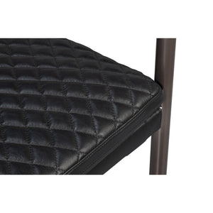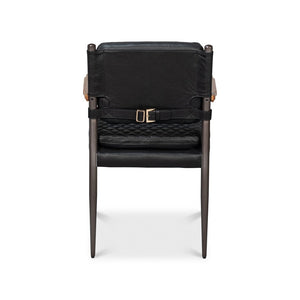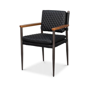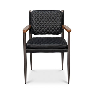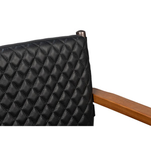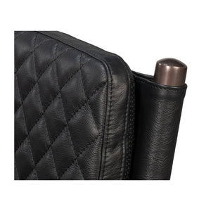 This Mid-Century Modern Black Leather Armchair combines sleek lines with refined comfort. The quilted onyx black leather upholstery offers a sophisticated texture, while the slim metal frame and warm wooden armrests highlight the chair’s elegant silhouette.