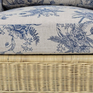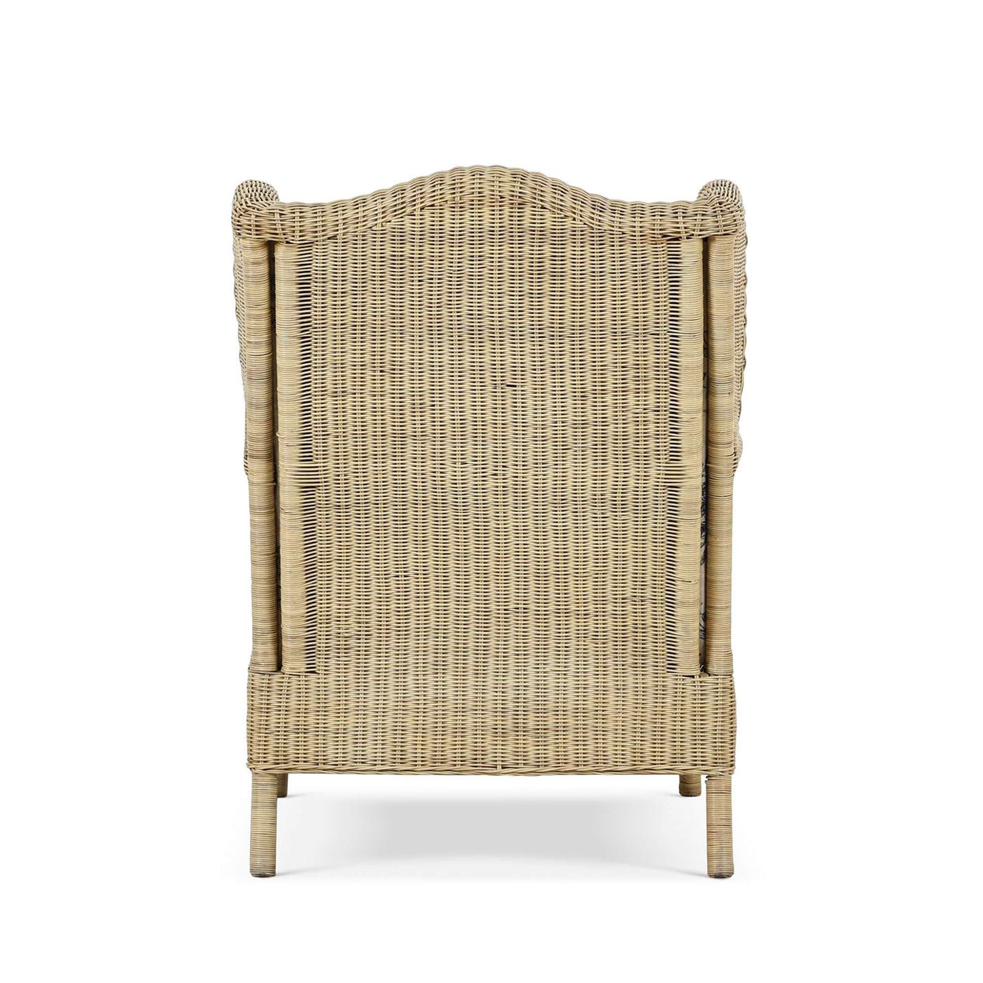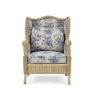 The French Country Rattan Wingback Armchair with Blue Toile Upholstery reinterprets a classic European silhouette through the lens of relaxed coastal living. Its high-backed winged form and gently rolled arms recall traditional 18th-century design, while the handwoven rattan frame with a natural finish introduces warmth, texture, and an inviting sense of ease.