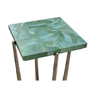 A captivating fusion of coastal elegance and artisanal craftsmanship, the Aqua Mist Square Accent Table is a statement of modern luxury. The square top showcases an intricate, hand-applied straw marquetry design, reminiscent of ocean waves in tonal blue hues. A protective lacquered finish enhances the beauty of the straw inlay, ensuring lasting vibrancy and durability.