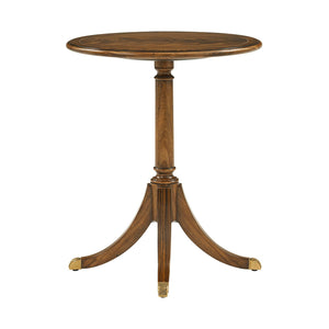 A turned pedestal base supports the top with graceful symmetry, while four saber legs curve outward and rest on ornate brass caps, grounding the piece in neoclassical tradition. Finished in a warm medium brown tone, this table makes a sophisticated statement as a side or entryway accent.