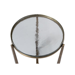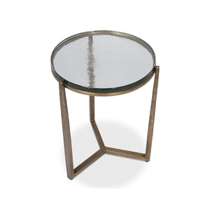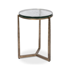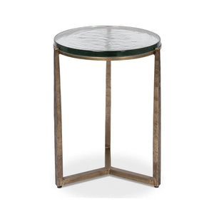 Elevate your living space with the Round Contemporary Accent Table, a striking blend of artisanal craftsmanship and modern design. This exquisite piece features a hand-forged iron base in an aged brass finish, lending a touch of vintage elegance while maintaining a sleek contemporary aesthetic. The casted glass top, with its organic texture, adds depth and character, reflecting light beautifully to enhance any interior.