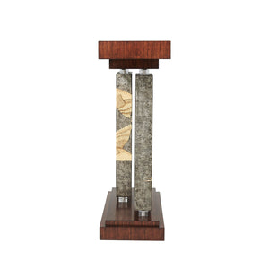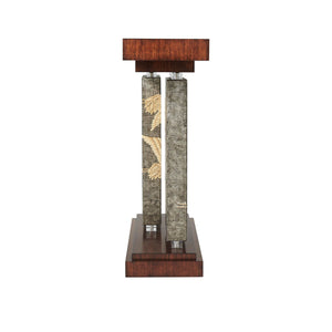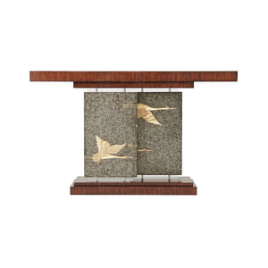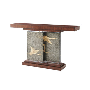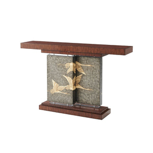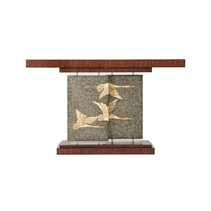 Art Deco Console Table, An Art Deco style Hyedua veneered console table, the rectangular top supported by two offset pewter Argento panels hand-painted with flying cranes and with acrylic bases and capitals, on a stepped plinth base.