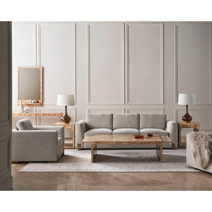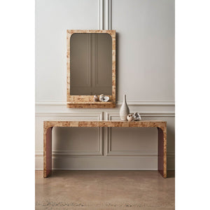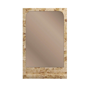 Burl Wood Mirror, an organic yet elegant statement with this streamlined mirror, framed in exotic mappa burl veneers. Tinted bronze casts a warm glow, complemented by a natural interplay of light and dark tones.