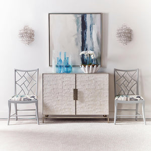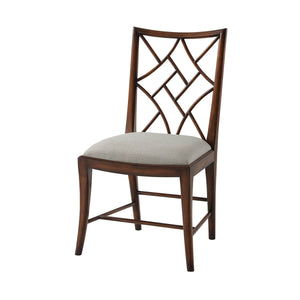 The Chinoiserie Cockpen Dining Chairs blend timeless elegance with refined craftsmanship. Featuring an intricate openwork lattice back, they honor the classic Chippendale style with graceful lines and exquisite detail. A solid wood frame with a rich stain and subtly curved tapered legs enhances their poised silhouette. The cushioned seat, upholstered in premium neutral fabric, ensures comfort and versatility.