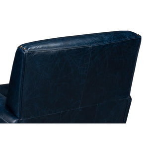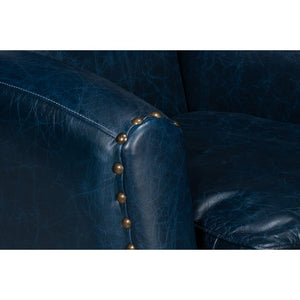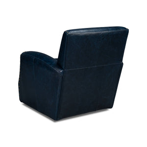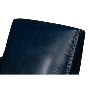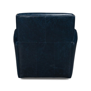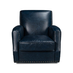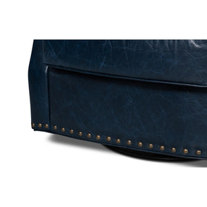 Classic Blue Leather Swivel Armchair, a classic style Chateau Blue leather upholstered armchair, upholstered with pure aniline top grade leather, with large nailhead details on a swivel base.