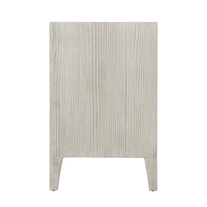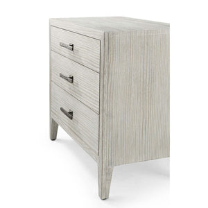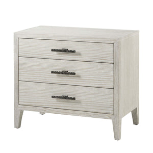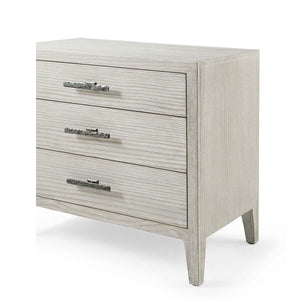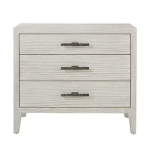 Coastal Breeze Nightstand, in our Sea Salt finish, the nightstand is constructed using quartered pine accented with uniquely cast ribbed bar hardware in the Dark Sterling finish. Resting on tapered legs with three soft closing drawers.