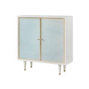 This elegant piece features a white lacquer case and has two sea glass acrylic doors, reminiscent of the treasures you find on the shore.