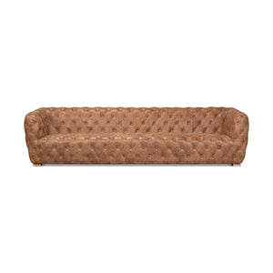 A contemporary-style tufted leather sofa with uniform back and arm height. This sofa has a generous long length and is tufted on its interior and exterior including back and sides. It is upholstered in a transitional tan leather color and rests on block legs.