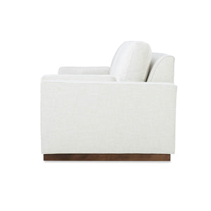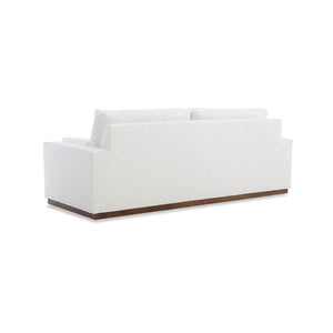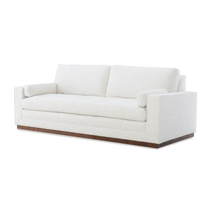 Custom Art Deco Style Sofa - Elevate your home with the sofa's meticulous craftsmanship. With two loose back cushions and a boxed cushion seat, with low profile arms, raised on a simple stepped-back wooden plinth base.