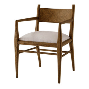 Dark Oak Parquetry Dining Arm Chair - A dark oak dining armchair with tapered legs. This classic chair is crafted from hand-carved oak and features a parquetry design. It has an upholstered seat for comfort, its top and mid-rail bar are joined by stretchers.