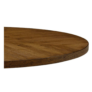 A dark oak parquetry round dining table with column pyramid base. This elegant table is detailed with a herringbone oak parquetry base and radial veneered top. It has been hand-made and given our Dusk finish.