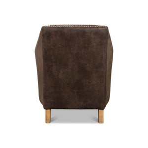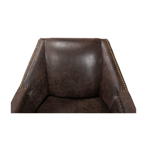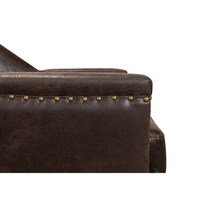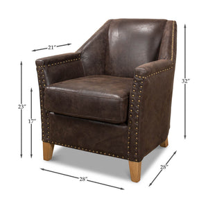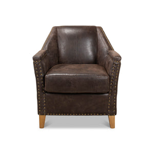 Eclectic Modern Leather Armchair with a coffee finish antiqued leather, with a+America oak legs and large nailhead trim details.