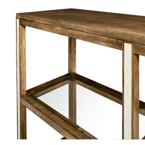 The front and back rails of this etagere feature a faux bone inlay that adds an intricate and tactile dimension to the piece. With three framed glass shelves, this etagere provides ample space for displaying your favorite items.
