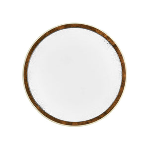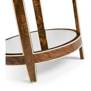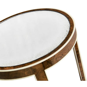 The antiqued mirrored top and shelf infuse a sense of vintage glamour and feature faux bone inlay, adding a touch of elegance and contrast to the table. The line is repeated down the delicate legs to the tapered feet, adding a beautiful contrast to this classic silhouette.