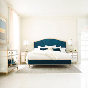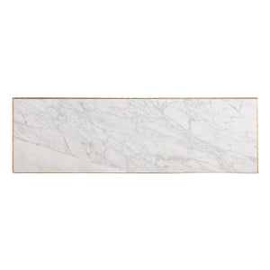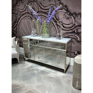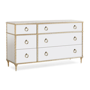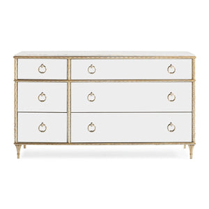 Atop sits a durable Carrara white marble, renowned for its pristine beauty and robustness, which complements the dresser's mirrored exterior and adds a touch of timeless elegance. The six spacious drawers, equipped with undermount soft-close drawer guides, ensure seamless and quiet operation, fully finished in a luxurious Crème De La Crème to offer a soft textural contrast.