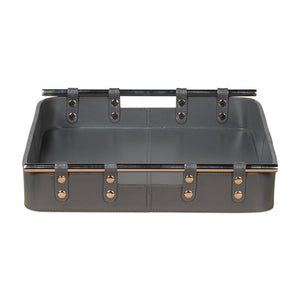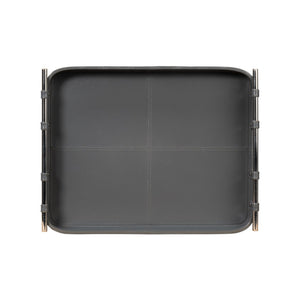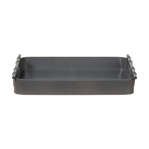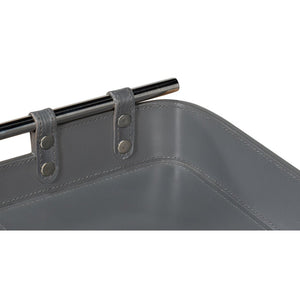 Grey Leather Tray, with the quiet shade of grey leather, this leather tray is fraught with detail: the topstitching of each leather panel, the narrow leather straps that hold the stainless steel handles in place.