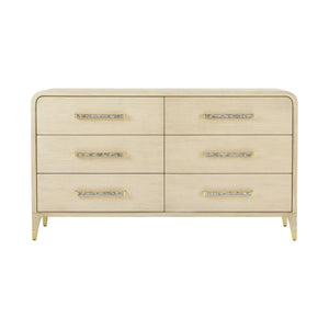 Six drawers offer generous storage, each adorned with elongated hardware detailed in mother-of-pearl accents for a touch of luminous sophistication. Brass-capped legs ground the design with glamour, making it a stunning addition to both modern and transitional interiors.