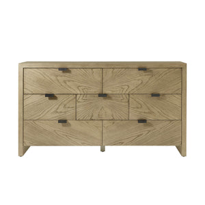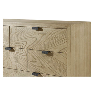 Light Ash Long Dresser, a sleek seven-drawer dresser made of figured cathedral ash in a light Dune finish with textured metal pulls in our Ember finish and soft close drawers.