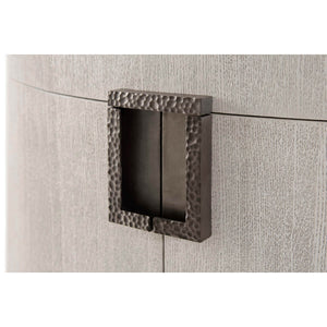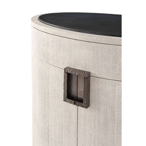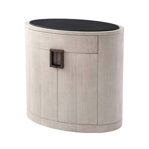 Light Oak Oval Nightstand in a brushed oak gowan finish, the oval basalt inset top, with a hammered metal handle with a matte tungsten finish, a frieze drawers above a two-door cabinet enclosing an adjustable shelf.
