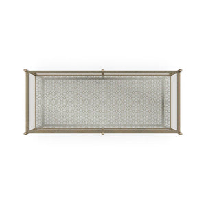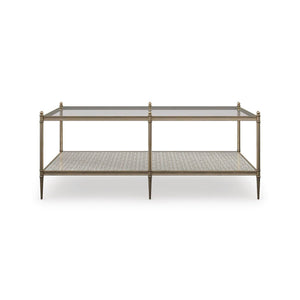 Crafted in a modern mix of materials, its streamlined frame adds a note of luxe in a New Gold finish. A clear glass top reveals a mirrored shelf below, back-painted in a Silver Leaf, mosaic pattern for added dimension.
