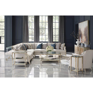 The rectangular shape with inset clear glass top, above square tapered legs with metal ferrules in Whisper of Gold cap its acrylic legs.