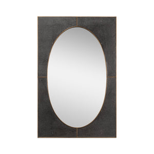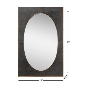 The Mid Century Antique Grey Leather Mirror exudes refined elegance with its striking combination of textures and shapes. Featuring an oval beveled mirror, it is beautifully set within a rectangular frame wrapped in antique grey-black shagreen embossed leather. The subtle texture of the embossed leather enhances its luxurious design, while the beveled glass adds depth and sophistication.